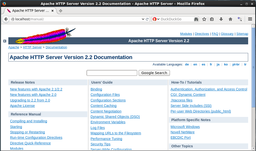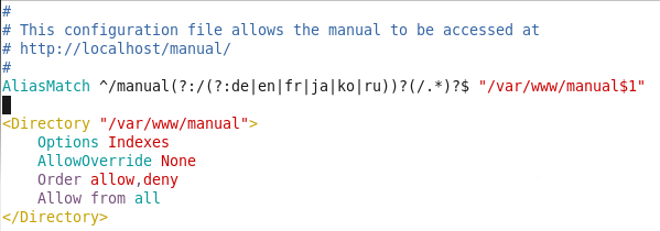 Cuando apache está recién instalado usualmente viene con un manual el cual está configurado como un álias, el cual se puede ver desde un navegador como se puede apreciar en la imagen de abajo al entrar en la URL localhost/manual. Aunque es útil, otra de las tareas comunes de configuración básica es quitarlo, como se hará a continuación.