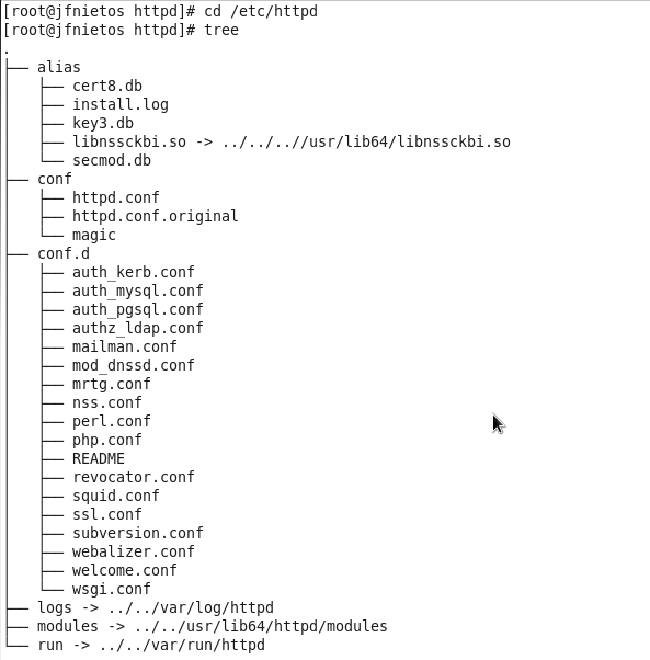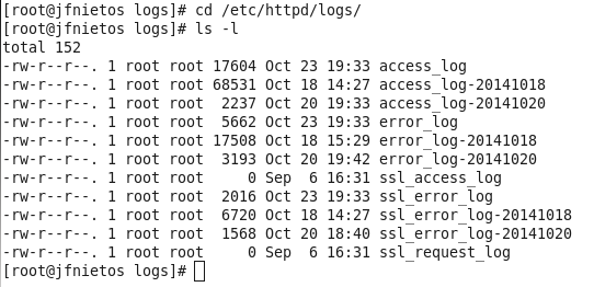 Todos los archivo de configuración de apache se encuentran en la ruta /etc/httpd/, dentro de la cual hay secciones a destacar como lo son la carpeta de logs que es donde van todos los registros de errores y accesos que genera y recibe respectivamente el servicio de apache; aunque esta carpeta esté aquí en realidad como muestra la imagen siguiente la carpeta esta en /var/log/httpd/. Ahora, dentro de la carpeta conf/ esta el archivo de configuración principal de apache (httpd.conf) el cual contiene toda la configuración del servicio, aunque esta puede ser divida en varios archivos para una administración mas fácil.