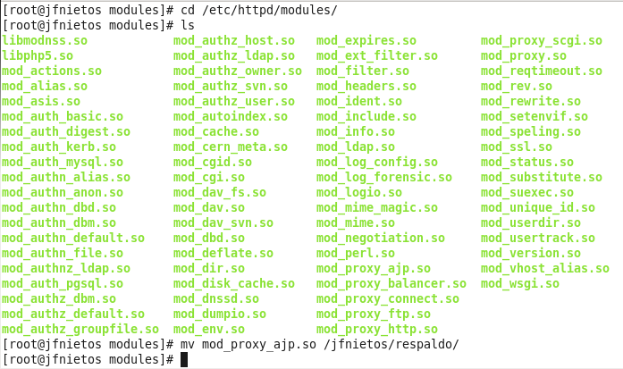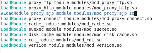 Apache por defecto trae un módulo activado llamado proxy_ajp_module el cual permite actualizaciones automáticas en el servidor apache, lo cual puede convertirse en una vulnerabilidad del sistema, por ello es mejor desactivarlo comentando la linea dentro de httpd.conf y mover el módulo de la carpeta modules/ a otra parte como se muestra a continuación.
