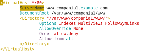 Como muestra la imagen siguiente el VirtualHost se crear dentro de una directiva llamada <VirtualHost *:80> en la que se declara que estará escuchando en cualquier dirección ip y en el puerto 80. Dentro se debe asignar un ServerName el cual es el dominio que se le asignará y un DocumentRoot que identifica cual es la carpeta contenedora de mas alto nivel de este sitio web.