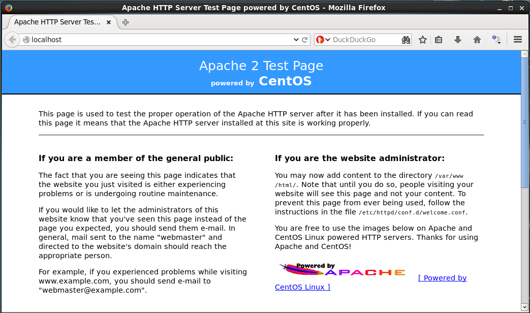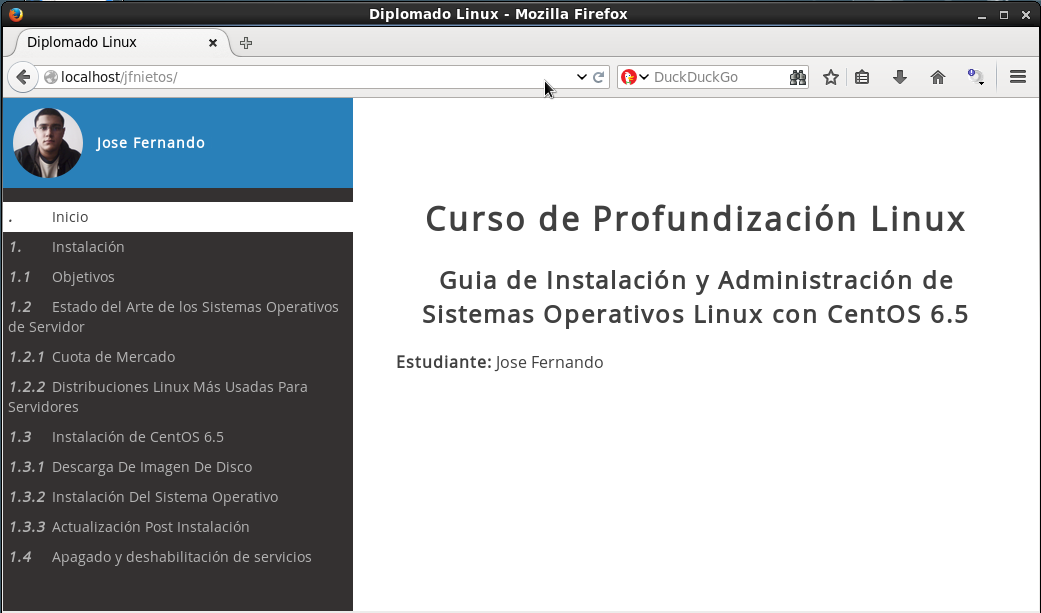 Por ultimo se reinicia el servicio de httpd y se prueba su funcionamiento desde un navegador web entrando a localhost o a la dirección ip directamente, esto mas el nombre del alias que se creó.