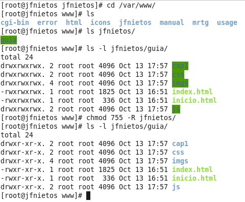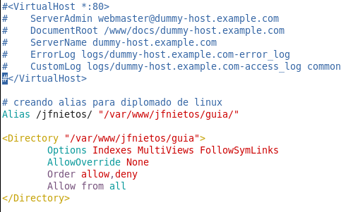 Entre los datos mas importantes en la configuración del alias, en este caso está que el nombre que recibe el alias es /jfnietos y la ruta real de los archivos es /var/www/jfnietos/guia/.